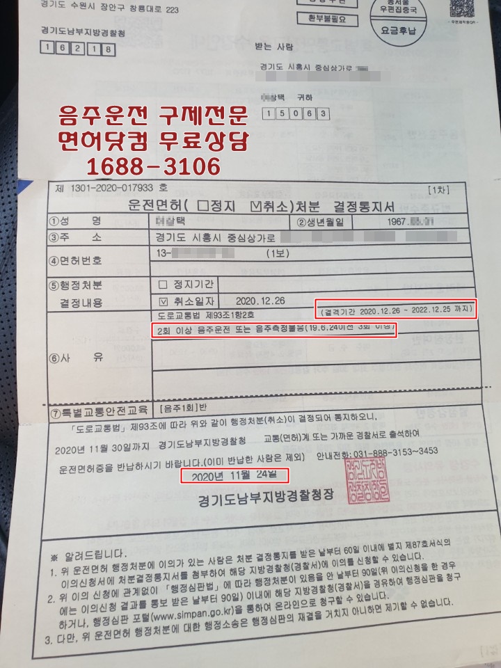 음주운전 2회 위반으로 면허취소처분을 받았으며,