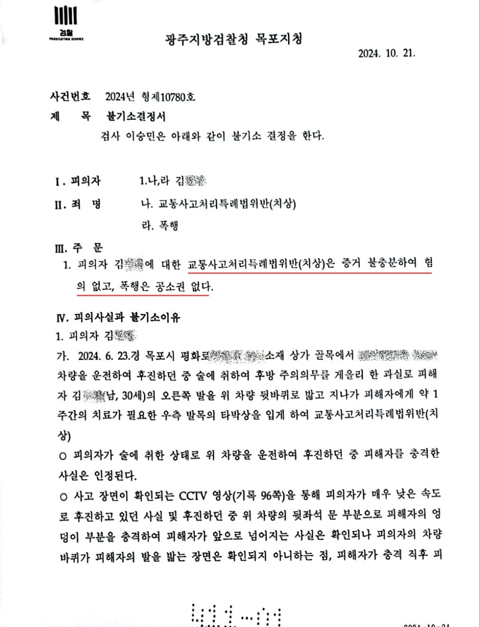 https://blog.naver.com/kangmk0992/223650870005 의뢰인은 지난 2024년6월23일02시20분경 전남 목포시 평화광장 인근 상호불상의 음식점에서 거래처 관계자와 음주를 하게 되었습니다. 음주를 한 의뢰인은 당연히 대리운전을 불러 귀가하려고 대리운전을 호출하였으며, 02시29분경 대리기사님이 배정되었다는 확인 문자를 받고 차량이 주차되어 있는 곳으로 이동하였습니다. 그런데 다른 상가 앞에 주차를 했던 의뢰인에게 누군가 다가와서 "남의 가게 앞에 주차를 하면 어떻게 하느냐?"면서 화를 내어 어쩔 수 없이 차를 조금 빼주는 과정에서, 지나던 행인들이 차량에 부딪쳤다면서 시비를 걸어왔습니다. 후방카메라에 아무것도 보이지 않았었고, 경고음도 없었는데 어떻게 차와 부딪칠 수가 있느냐?면서 서로 언쟁을 하게 되었으며, 행인들과 멱살을 잡는 등 다툼으로 이어졌으며, 결국 경찰까지 출동하게 되었던 것입니다. 의뢰인이 음주를 한 것을 알고 일부러 다가와 시비를 건 것으로 추측이 되며, 강제로 자동차 키를 가져가고, 돌려달라는 여자 친구에게 경찰이 도착을 한 후에도 욕설을 하면서 계속하여 시비를 걸어왔습니다. 그런 와중에 대리기사가 도착을 하였지만, 경찰은 아무리 조금 움직였어도 음주운전에 해당되므로 음주측정을 하여야 한다고 하시었고, 음주측정을 한 결과 0.118%라는 높은 수치가 측정되어, 음주운전 혐의로 경찰조사를 받게 되었습니다. 그런데 경찰조사를 받는 과정에서, 피해자라고 주장하는 사람이 사고 당시 멀쩡했고, 의뢰인의 멱살을 잡는 등 전혀 다치지도 않았는데, 경찰에 진단서를 제출하였던 것입니다. 결국 의뢰인은 도로교통법위반(음주운전), 교통사고처리특례법위반(치상), 폭행 등의 혐의로 사건이 검찰에 송치되었습니다. 하지만, 의뢰인은 이러한 상황이 납득이 되지 않았습니다. 사건 당일 cctv 영상을 보아도 가볍게 스치는 정도에 허리우드액션을 하면서 넘어진 사실,. 고통을 호소하지도 않은 사실이 명확함에도, 경찰은 피해자가 진단서를 제출 하였다는 사실만으로 , 운전면허취소처분에 결격기간 2년의 행정처분을 하였습니다. 이에 의뢰인은 음주인피사고로 한 경찰의 처분이 너무나 가혹하고, 부당한 처분이라 생각하여 저희 면허닷컴에 사건을 의뢰하시었습니다. 사건을 의뢰받은 저희 면허닷컴은 음주운전에 따른 처벌은 인정하지만, 인피사고로 인한 결격기간 2년의 처분은 위법 , 부당하다 사료되어 재수사를 요하는 탄원서를 제출하게 되었습니다. 그 결과 2024년10월21일, 검찰로부터 교통사고처리특례법위반 치상 혐의와, 폭행 혐의에 대하여 증거불충분 무혐의 처분결정을 받음으로서, 운전면허취소 결격기간 2년의 처분에서 1년으로 변경처분을 받게 되었으며, 통상, 음주운전 형사처벌 기준에 따르면, 음주수치가 0.08%부터 0.2%일 경우,. 벌금 500만 원 이상 1천만 원 이하이므로, 벌금 700만 원정도 예상 되었으나, 벌금 500만원으로 처벌을 받게 되었습니다. 검찰은 결정문에서, 경찰이 피해자가 오른쪽 발을 뒷바퀴로 밟고 지나갔다고 주장하면서, 약 1주간의 치료를 요하는 우측발목 타박상을 입게 하였다 하여, 교통사고처리특례법위반 치상의 혐의를 추가하여 송치하였으나,. 피해자의 발을 밟는 장면이 확인 되지 않았고, 피해자가 충격직후 이동하는 동안 발을 절거나, 고통을 호소하는 듯 한 장면이 확인 되지 아니하며,. 서로 다투는 동안에도, 발로 땅을 강하게 디디면서도 전혀 아픈 기색이 없었다는 점, 등에 비추어 차량으로 인하여 상해가 발생하였다고 단정하기 어렵고,. 달리 이를 인정할 증거가 부족하다 하여, 증거불충분하여 혐의 없다는 결정을 하였으며,. 이에 의뢰인은 인피사고에 대하여 무혐의처분을 받음으로서, 운전면허결격기간 2년의 처분에서 1년의 처분으로 변경처분을 받게 되었습니다 . 최근 경미한 교통사고 임에도 음주운전을 빌미로 과잉진료를 받고, 진단서를 제출하는 등 보험사기에 가까운 형태가 많이 발생하여 사회적인 문제가 되고 있습니다. 물론 음주운전은 어떠한 경우라도 정당화 될 수 없는 변명의 여지가 없는 큰 잘못임을 인식하여야 할 것입니다. 하지만, 음주운전을 하였다는 이유만으로, 없는 잘못까지 처벌을 받으면 안 될 것입니다. 음주운전에 따른 잘못은 인정하고, 법이 허용하는 범위 안에서 처벌을 받아야 함이 마땅하기에 저의 면허닷컴은 억울하고, 과중한 처벌을 받는 일이 없도록, 의뢰인의 권익을 위해 최선을 다하고 있습니다. 뜻하지 않은 음주운전, 음주인피사고 등으로 고통을 받고 계시다면, 언제든지 무료상담이 가능하오니 망설이지 마시고 연락주시기 바랍니다. https://youtu.be/_sd9KzQ4eqk?si=P0Jl9fBUiJxRZHYb |