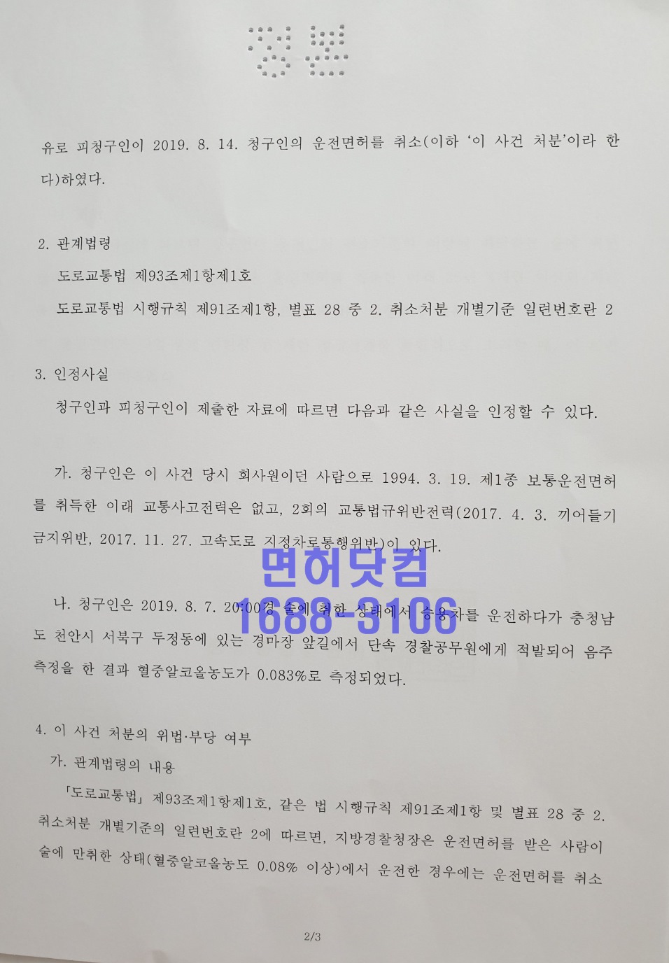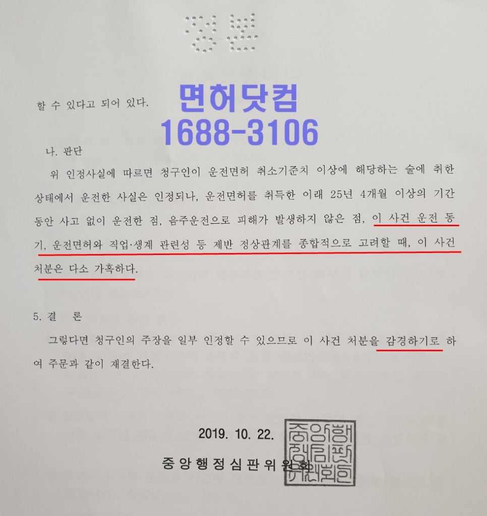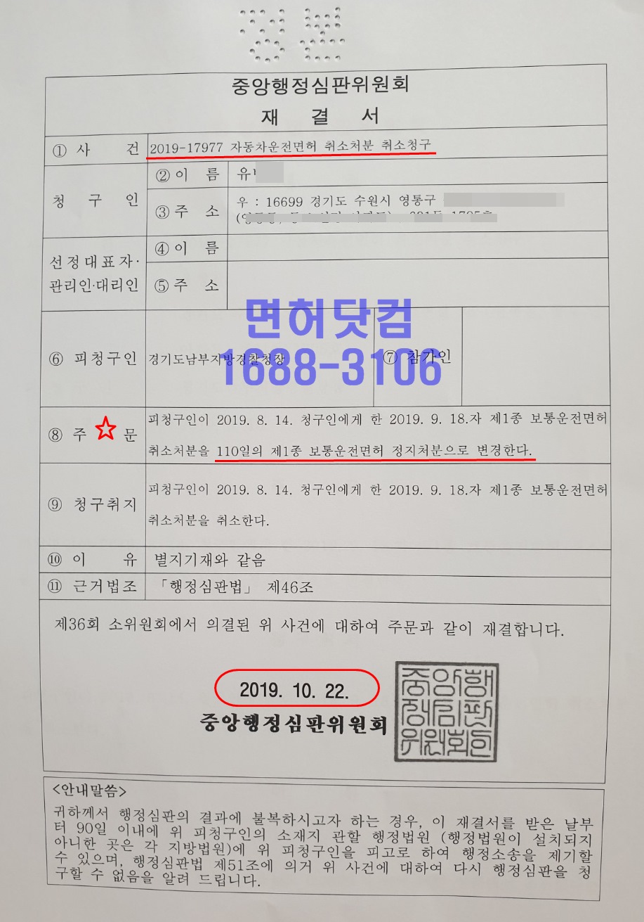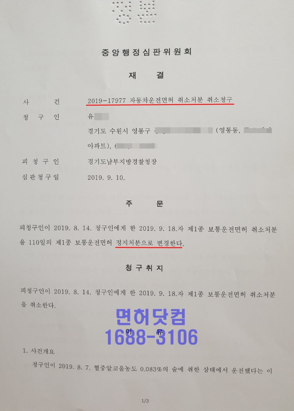 그결과 이의신청은 부결되었으나, 행정심판에서 면허취소처분에서 110일 면허정지처분으로 감경을 받았습니다.