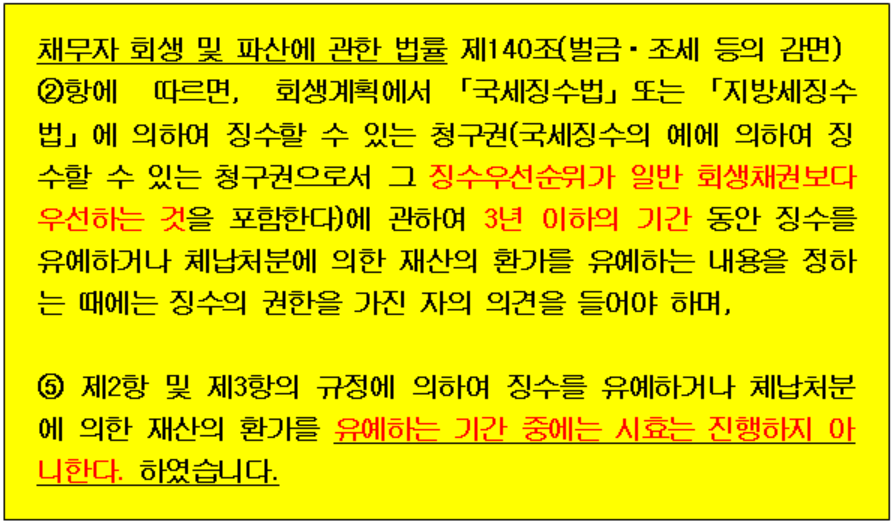 채무자 회생 및 파산에 관한 법률 제140조(벌금ㆍ조세 등의 감면) ②항에 따르면, 회생계획에서 「국세징수법」또는 「지방세징수법」에 의하여 징수할 수 있는 청구권(국세징수의 예에 의하여 징수할 수 있는 청구권으로서 그 징수우선순위가 일반 회생채권보다 우선하는 것을 포함한다)에 관하여 3년 이하의 기간 동안 징수를 유예하거나 체납처분에 의한 재산의 환가를 유예하는 내용을 정하는 때에는 징수의 권한을 가진 자의 의견을 들어야 한다. <개정 2010. 3. 31., 2016. 12. 27.>