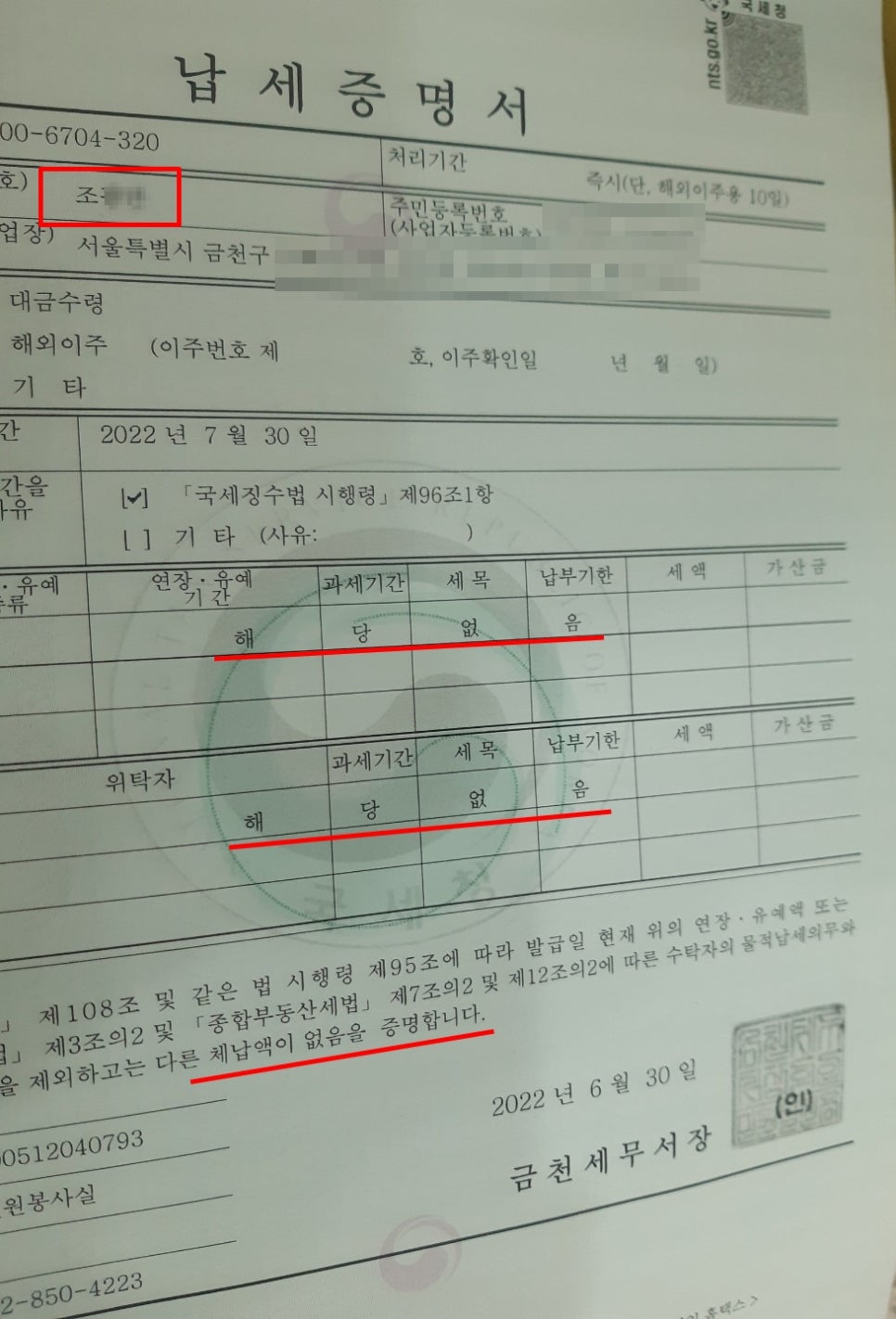 저희 행정사무소에 의뢰하시어 소멸시효 완성으로 체납된 국세인 부가가치세를